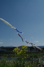/ 川,植物,花,菜の花,こいのぼり,建物,河畔植生,岩石,鉄塔,山,空,雲