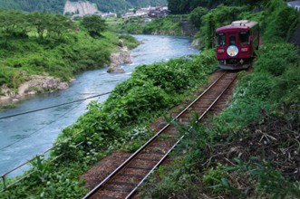 / 川,岩石,橋,鉄道,植物,河畔植生,木,電柱,車,人,ガードレール