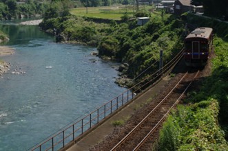 / 川,植物,河畔植生,木,レール,鉄道,建物,電柱,電線,ガードレール