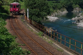 / 川,植物,河畔植生,木,レール,鉄道,建物,電柱,電線,ガードレール,岩石,河原