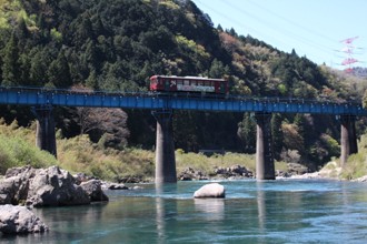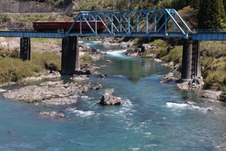 / 川,岩石,橋,鉄道,植物,河畔植生,木,鉄塔,電線,山,空