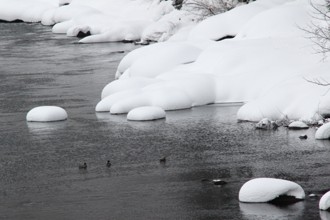 / 川,岩石,雪,植物,河畔植生,鳥,カモ,かも,鴨,マガモ