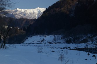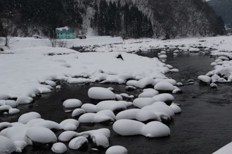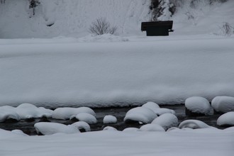/ 川,岩石,雪,植物,河畔植生,木,山,建物,電線,電柱,空