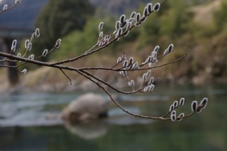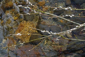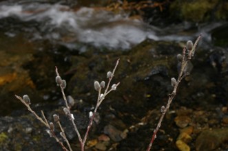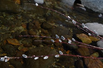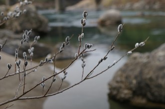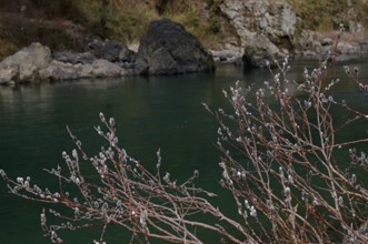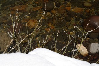/ 川,岩石,植物,河畔植生,木,ヤナギ,花,雪
