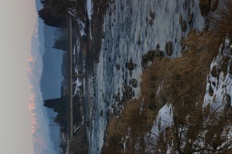 / 川,岩石,雪,植物,河畔植生,木,橋,電柱,電線,建物,山,空