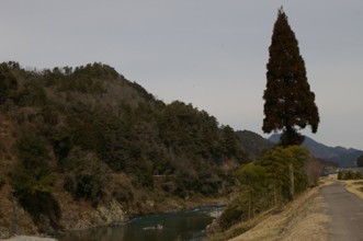 / 川,岩石,植物,河畔植生,木,ガードレール,竹,道路,電柱,建物,山,空