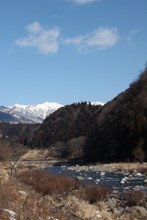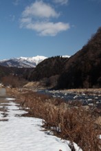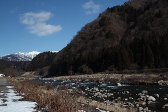 / 川,岩石,植物,河畔植物,木,山,建物,電柱,空,雲,雪