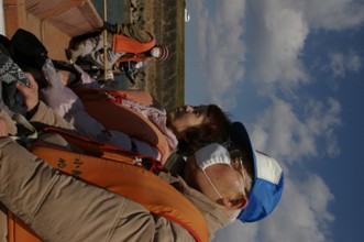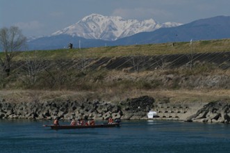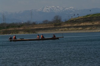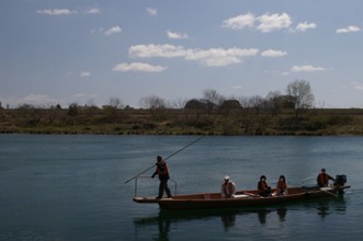 / 川,船,エンジン,人,マスク,眼鏡,救命胴衣,手袋,帽子,堤防,植物,消波ブロック,空,雲