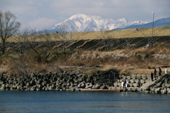 / 川,船,エンジン,人,救命胴衣,子供,帽子,手袋,箱,消波ブロック,堤防,植物,階段,木,建物,山,空,雲