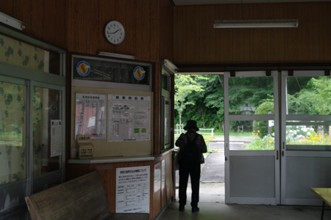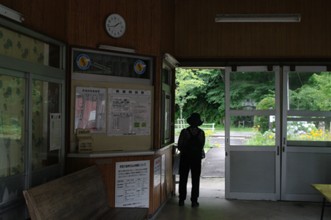 / 線路,電車,長良川鉄道,道路,岩石,植物,看板,建物,駅舎,時刻表,椅子,人,鞄,帽子,木,森林