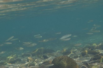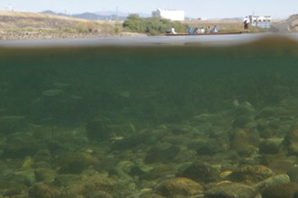 / 川,川底,岩石,魚,船,人,エンジン,堤防,木,建物,消波ブロック,空,山,電線,鉄塔,電線,植物,車