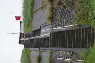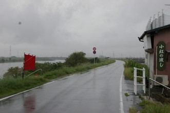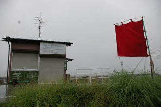 / 階段,堤防,建物,アンテナ,旗,植物,空,カラーコーン,人,長靴,帽子,傘