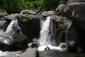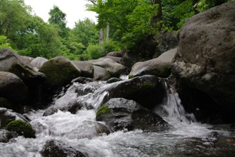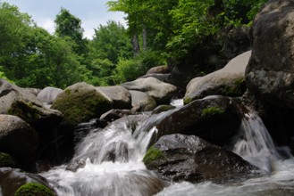 / 川,岩石,河畔植生,植物,水しぶき,木,森林