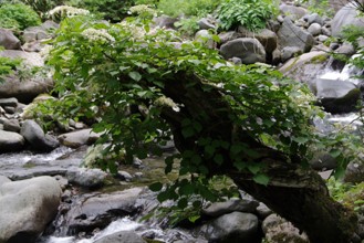/ 川,岩石,河畔植生,植物,水しぶき,花