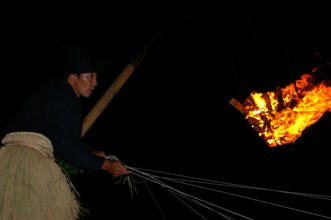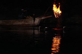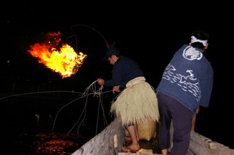 / 鵜飼い,漁,人,鵜匠,かがり火,船,はちまき,火の粉