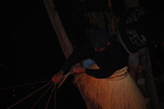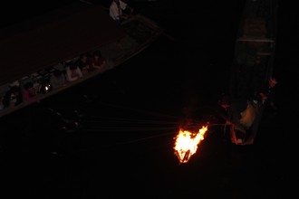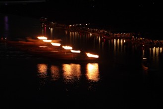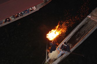 / 鵜飼い,漁,人,鵜匠,かがり火,船,はちまき,火の粉,カゴ,スマホ,携帯電話