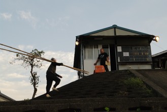 / 建物,階段,人,サンダル,眼鏡,植物,木,救命胴衣,黒板,空,雲