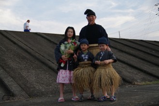 / 人,子供,サンダル,靴,和服,建物,笑顔,植物,鵜匠,花,花束,電線,電柱,法被,空,雲