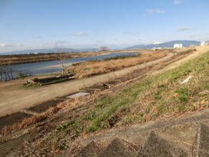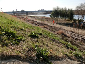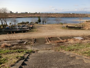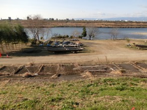 / 川,船,木,植物,河畔植生,建物,山,三角コーン,ブロック,堤防