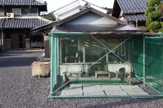 / 建物,鵜,ウ,鳥,カゴ,砂利,室外機,ポスト,瓦,植物,木,電線,空