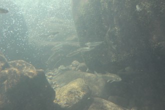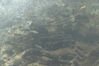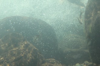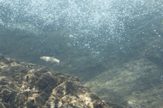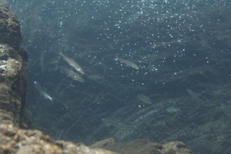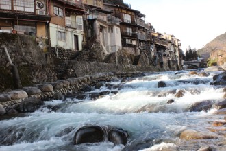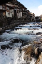 / 川,岩石,しぶき,建物,山,植物,空,雲,木