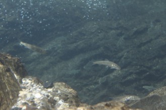 / 川,岩石,しぶき,建物,山,植物,空,雲