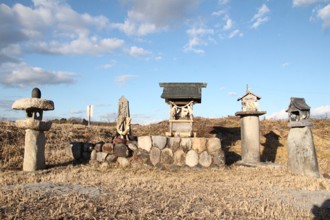 / 空,雲,河畔植生,竹,植物,神社,岩石