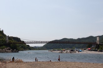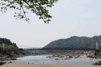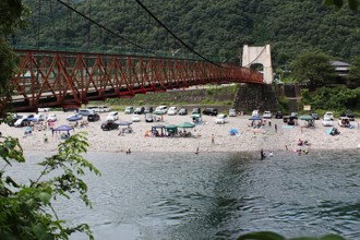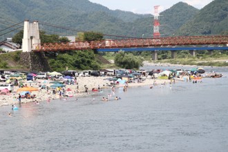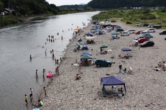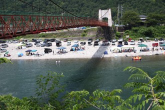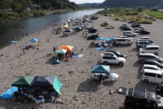 / 空,山,川,河原,人,車,テント,建物,河畔植生