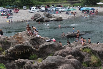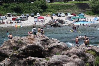 / 人,岩石,神社,川,河原,テント,車