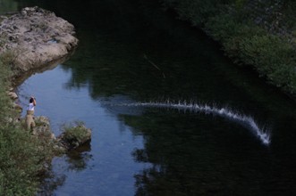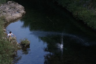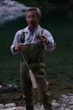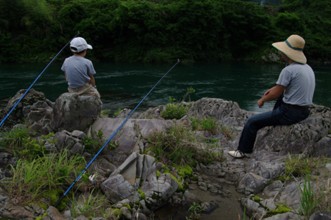 / 山,川,人,子供,帽子,釣り,岩石,河畔植生