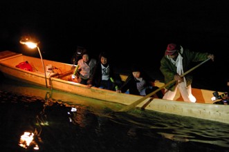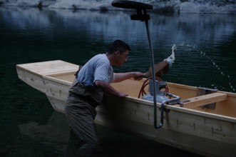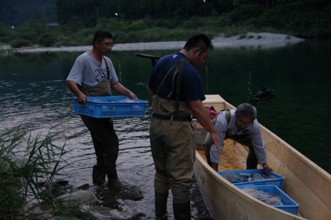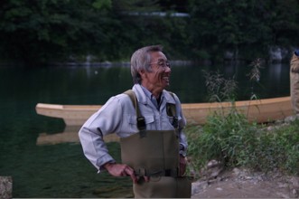 / 川,人,船,漁,河畔植生,山,眼鏡