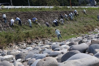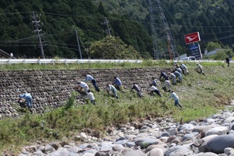 / 山,電柱,電線,人,石垣,河原,岩石,看板,建物