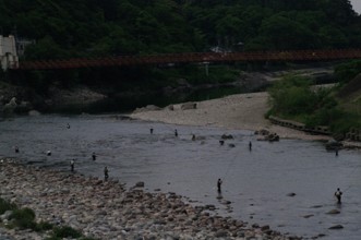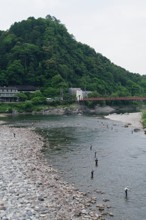 / 山,橋,建物,川,河原,岩石,釣り,人