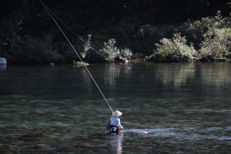 / 人,笠,釣り,川,河畔植生,木