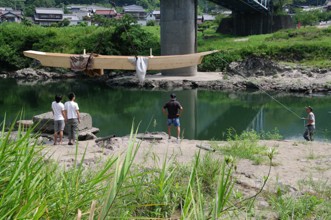 / 人,帽子,船,川,河原,河畔植生,建物