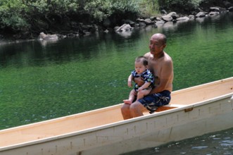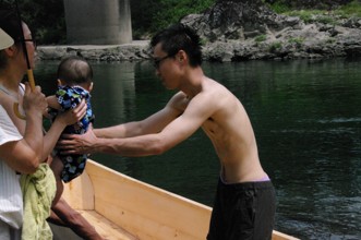 / 人,川,船,子供,岩石,河畔植生