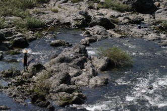 / 川,人,笠,岩石,河畔植生,釣り