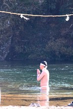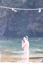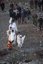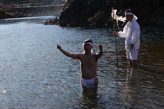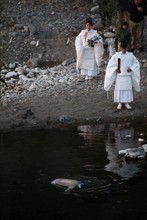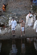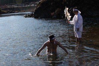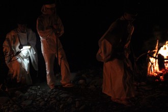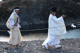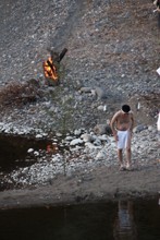 / 人,植物,川,裸,靴,サンダル,はちまき,火,縄,落ち葉