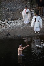 / 人,川,植物,河畔植生,和服,眼鏡,縄,岩石,はちまき,靴,草履