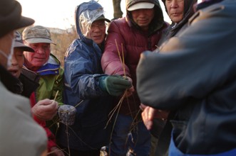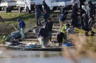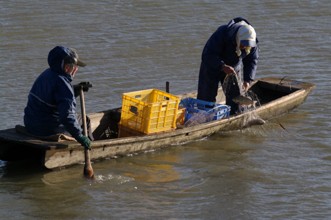 / 人,川,船,帽子,かご,眼鏡,網,魚
