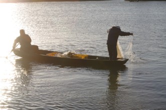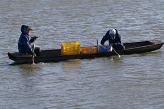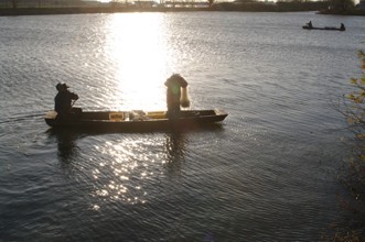 / 人,川,船,帽子,かご,網,魚,眼鏡