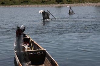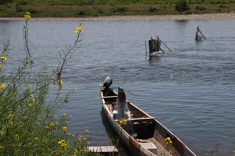 / 川,船,花,網,植物,河畔植生,木,岩石