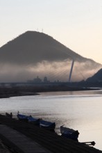 / 川,山,霧,植物,河畔植生,木,鉄塔,建物,船