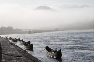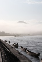 / 川,山,霧,植物,河畔植生,木,鉄塔,建物,船,旗