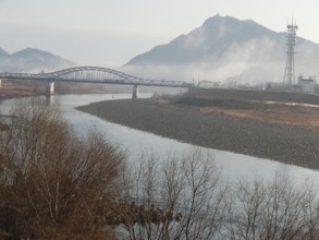 / 川,山,霧,植物,河畔植生,木,鉄塔,建物,船,人,旗