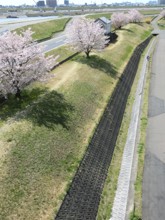 / 川,木,桜,植物,河畔植生,カーブミラー,建物,重機,ショベルカー,堤防