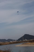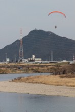 / 山,空,堤防,鉄塔,植物,河畔植生,看板,人,パラシュート,建物,電柱,金華山,城,岐阜城,橋,木