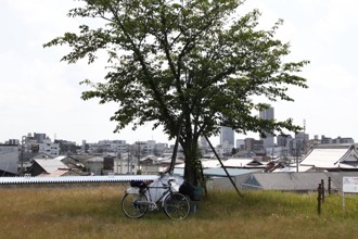 / 人,堤防,植物,河畔植生,川,消波ブロック,堤防,帽子,鉄塔,橋,車