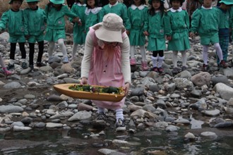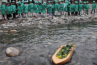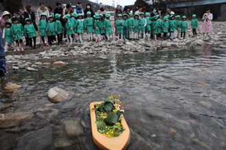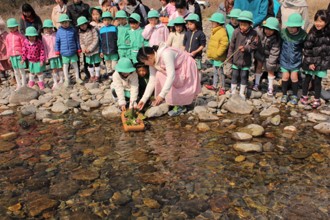 / 人,岩石,川,子供,植物,帽子,車,建物,マスク,手袋,標識,電柱,花