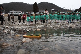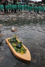 / 子供,人,岩石,橋,川,植物,街灯,空,帽子,鞄,河畔植生,建物,車,花